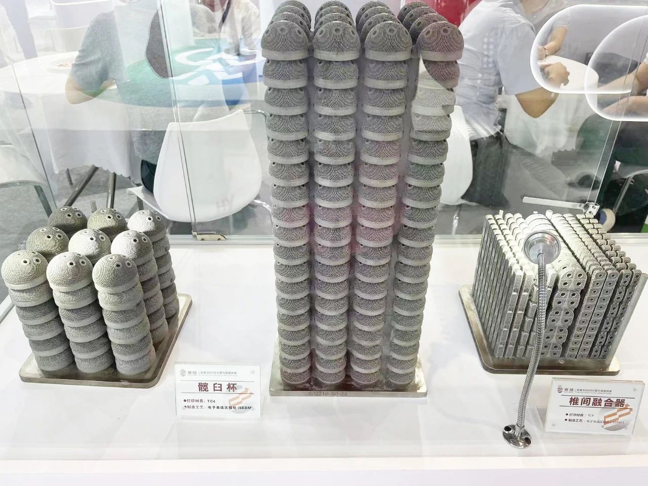 此次TCT展會(huì),西安賽隆重點(diǎn)介紹了自主知識(shí)產(chǎn)權(quán)、行業(yè)獨(dú)有的搭載間熱式電子槍的系列化電子束3D打印設(shè)備及超高轉(zhuǎn)速的桌面級(jí)和工業(yè)級(jí)等離子旋轉(zhuǎn)電極霧化制粉設(shè)備,并面向不同的應(yīng)用領(lǐng)域,展示了電子束3D打印最新案例。在醫(yī)療領(lǐng)域,西安賽隆展示了不同成形尺寸的滿板鈦合金椎間融合器、滿板鈦合金髖臼杯以及高精度多孔鉭髖關(guān)節(jié)、膝關(guān)節(jié)墊塊,目前公司已成功助力邁瑞骨科3D打印髖臼杯系統(tǒng)獲三類醫(yī)療器械注冊(cè)證。在汽車領(lǐng)域,西安賽隆展示了電子束3D打印半軸類和輪轂類純銅感應(yīng)線圈,相關(guān)產(chǎn)品已在國內(nèi)20余家汽車零部件龍頭企業(yè)的生產(chǎn)線進(jìn)行驗(yàn)證及應(yīng)用,使用效果優(yōu)異。此外,面向航空領(lǐng)域和科研領(lǐng)域的需求,西安賽隆還展示了300mm鈦鋁葉片、鈦合金雙點(diǎn)陣結(jié)構(gòu)等典型案例。